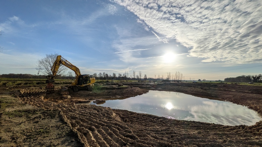 Die Maßnahme, die in der Förderagenda sachlich als „M15 Bullerbach“ geführt wird, trägt künftig mit dazu bei, dass ökologische Renaturierung und Umweltbildung am Bullerbach Hand in Hand gehen. Auf einem ehemaligen rund 1,4 ha großen Acker am Zugang zum Borkener Paradies ist eine naturnahe Auenlandschaft entstanden, die Fauna und Flora des Bullerbachs zugutekommen sollen. Nicht zuletzt ist dort mit dem „Blauen Klassenzimmer“ auch ein Bereich geschaffen worden, der die Natur für die Öffentlichkeit erlebbar macht. Für das „Blaue Klassenzimmer“ wurde eigens ein 1.200 m² großer Gewässerbereich mit verschiedenen Tiefenbereichen angelegt, in dem zukünftig die lokale Tier- und Pflanzenwelt erforscht werden kann. Mehrere große, locker angeordnete Natursteine laden Besuchende zum Sitzen und Verweilen ein und bieten durchaus auch einer Schulklasse für Unterricht im Grünen Platz. „Es ist nun ein Ort entstanden, der der Umweltbildung, Entspannung und Begegnung dienen soll“, sagt Landrat Marc-André Burgdorf.