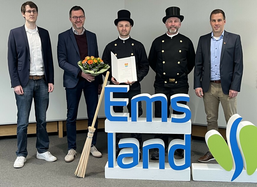 Bild: Dezernent Christoph Exeler (2. v. l.) und Torsten Pohlmann von der Schornsteinfegerinnung Osnabrück-Emsland (2. v. r.) gratulierten dem alten Amtsinhaber Christian Lake zur erneuten Verpflichtung als Bezirksschornsteinfeger für den Kehrbezirk OS/EL 02-10 Haselünne II. Mit dabei waren Janis Faller (l.) und Christoph Polke vom Landkreis Emsland. (Foto: Landkreis Emsland)