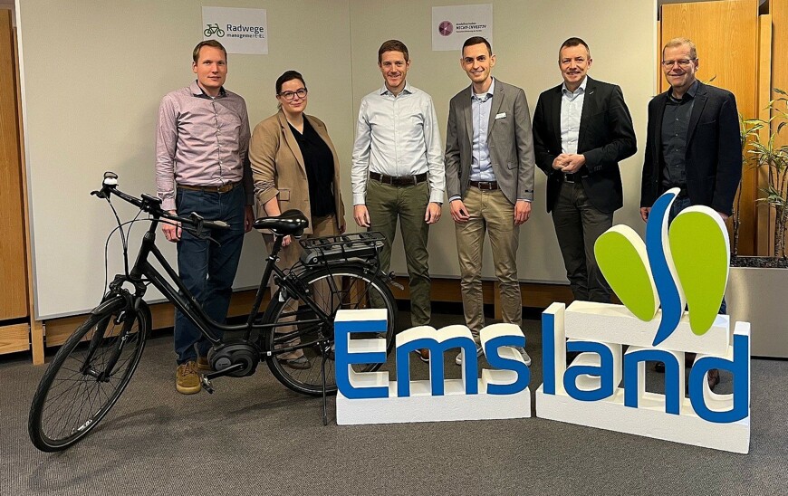 Bild: Projektteam des Radwegemanagements im Landkreis Emsland (v. l.): Michael Kuiter (Landkreis Emsland), Jana Busse, Prof. Dr.-Ing. Dennis Knese (beide Frankfurt University of Applied Sciences), der neue Radwegemanager Olav Hunting, Dezernent Michael Steffens, Ralf Wellmer (Landkreis Emsland). (Foto: Landkreis Emsland).