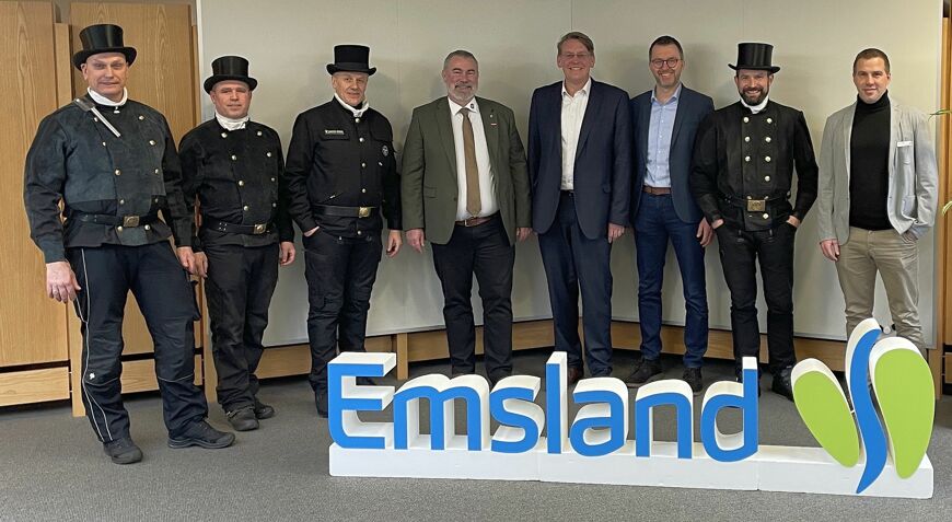 Meppen. Die traditionellen Neujahrsgrüße überbrachte eine Delegation der Schornsteinfegerinnung Osnabrück-Emsland an den Landkreis Emsland. Angeführt von Obermeister Sascha Große-Hartlage sowie vom stellvertretenden Obermeister Andreas Walburg erschienen die Glücksbringer im Meppener Kreishaus, wo sie Landrat Marc-André Burgdorf und der zuständige Dezernent Christoph Exeler willkommen hießen.
