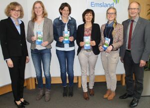 Bild: (v. l.) Sozialdezernentin Dr. Sigrid Kraujuttis, die Beraterinnen des Pflegestützpunktes Marlen Bentlage, Ina Kompmaker, Christiane Karwisch-Kattner, Raissa Lögers und Fachbereichsleiter Soziales, Richard Peters. (Foto: Landkreis Emsland)
