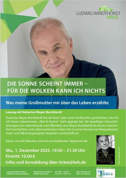Lingen. „Die Sonne scheint immer. Für die Wolken kann ich nichts“: Was meine Großmutter mir über das Leben erzählte – der Bestsellerautor, Gastgeber der NDR-Talkshow und Journalist Hubertus Meyer-Burckhardt gastiert auf Einladung der Gesundheitsregion Emsland mit seinem neuen Buch am Montag, 1. Dezember, von 19.30 bis 21.30 Uhr im Ludwig-Windthorst-Haus (LWH), Gerhard-Kues-Straße 16, in Lingen (Ems).