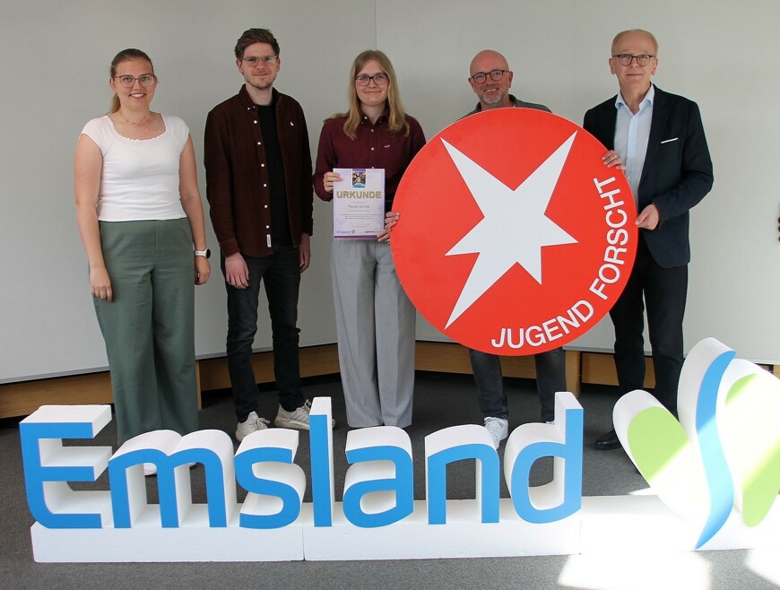 Erster Kreisrat Martin Gerenkamp gratulierte in Vertretung für Landrat Marc-André Burgdorf der hochtalentierten Jungforscherin nun im Meppener Kreishaus zu ihren Leistungen und zeichnete sie mit dem „Sonderpreis des emsländischen Landrats“ aus. Begleitet wurde sie von den Lehrkräften und Projektbetreuern Nicole Schröder und Nils Kreienhop sowie von Siegfried Wigger, Leiter des regionalen Jugend forscht-Wettbewerbs.