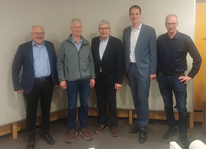 Bild: Der (v. l.) stellvertretende Verbandsvorsteher Arno Ester, der neue Verbandsvorsteher Franz Dörtelmann und sein Amtsvorgänger Bernd-Carsten Hiebing, Baudezernent Dr. Michael Kiehl und Michael Reiners vom Landkreis Emsland nach den Vorstandwahlen. (Foto: Landkreis Emsland)