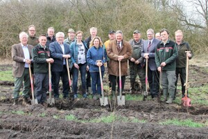 Bild: Die letzten Bäume des Klimaschutzwaldes pflanzte Landrat Reinhard Winter (6. v. r.) gemeinsam mit Bernhard van der Ahe, Vorsitzender der Naturschutzstiftung (5. v. l.), dem CDU-Kreistagsabgeordneten Gerhard Husmann (4. v .r.), Rhedes Bürgermeister Gerd Conens (9. v. r.) und Vertretern der Landwirtschaftskammer Niedersachsen und den Jägerschaften. (Foto: Landkreis Emsland)
