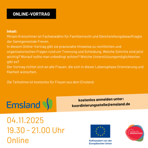 Die Koordinierungsstelle Frauen und Wirtschaft ist eine Einrichtung des Niedersächsischen Ministeriums für Soziales, Gesundheit und Gleichstellung in der Trägerschaft des Landkreises Emsland, gefördert aus Mitteln des Landes Niedersachsen und des Europäischen Sozialfonds.