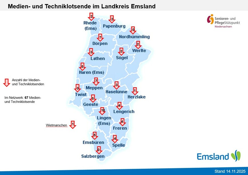 Sprechstunden / Digitalcafés werden in Aschendorf, Bawinkel, Dörpen, Emsbüren, Freren, Geeste OT Dalum, Haren (Ems), Haselünne, Lengerich, 2 x in Lingen (Ems), 2x in Meppen, Rhede (Ems) und Spelle angeboten.