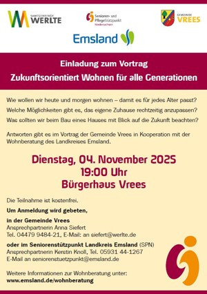 Gemeine Vrees, Dienstag, 04. November 2025, um 19.00 Uhr, im Bürgerhaus Vrees. Bitte auf das Bild zum herunterladen klicken.
