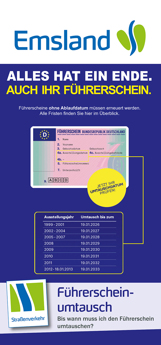 Zur Beantragung der Umstellung sprechen Sie bei Ihrer Führerscheinstelle in Meppen oder im Bürgerbüro Ihrer örtlichen Wohnsitzgemeinde / Stadtverwaltung persönlich vor. Nach dem einmaligen Behördengang wird der neue Kartenführerschein Ihnen bequem und direkt nach Hause geschickt (sog. Direktversand).